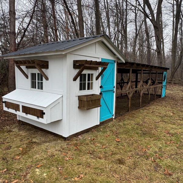 Designed for optimal flock comfort and ease of maintenance, this single-slant chicken coop offers a well-proportioned coop and run area. It includes a large cleanout door for efficient upkeep, along with abundant roosting perches and convenient nesting boxes. All coops can be made to any size.